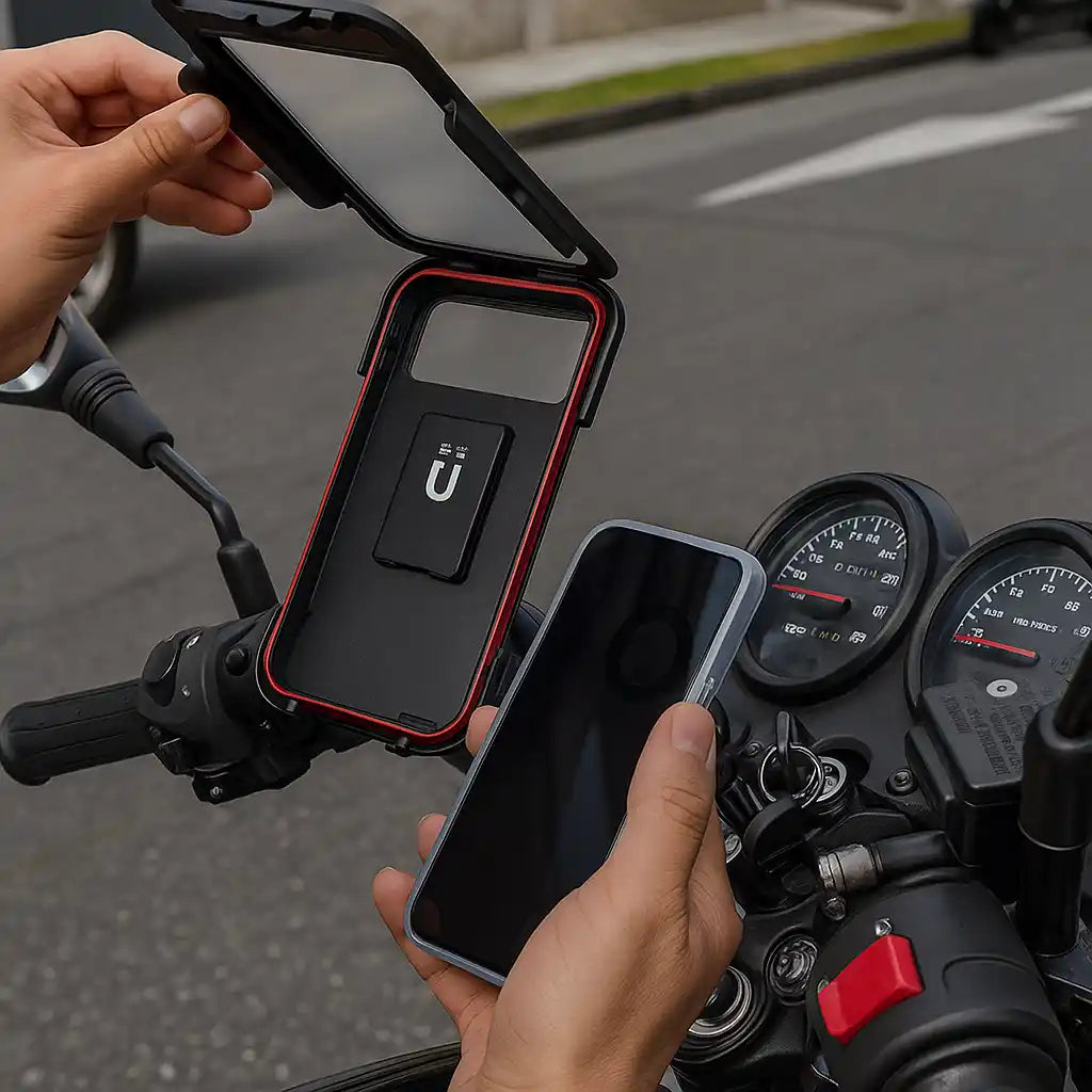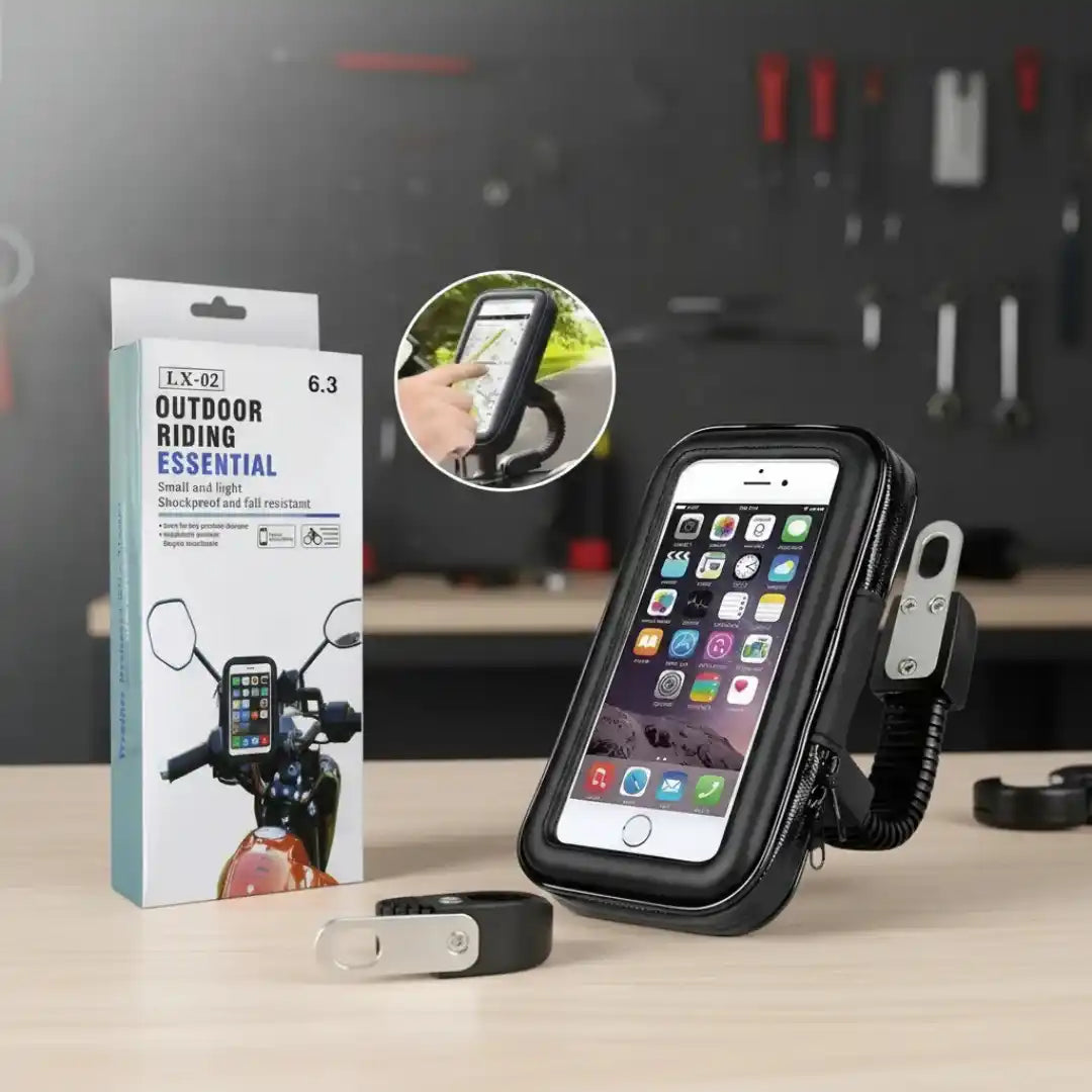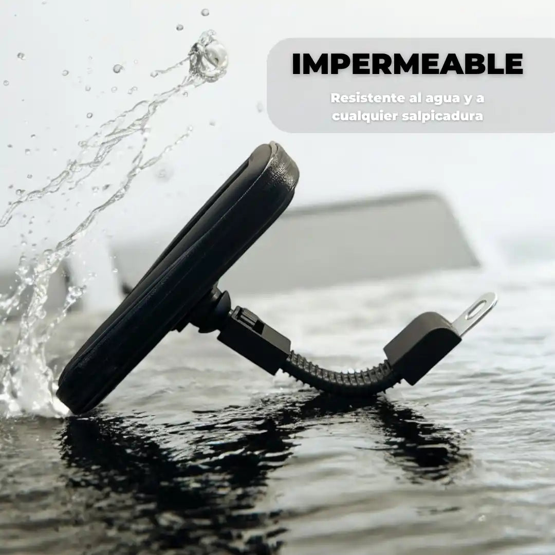 Este soporte impermeable está diseñado para acompañarte en cada aventura, sin importar el clima. Ideal para motos, cuatriciclos y bicicletas.